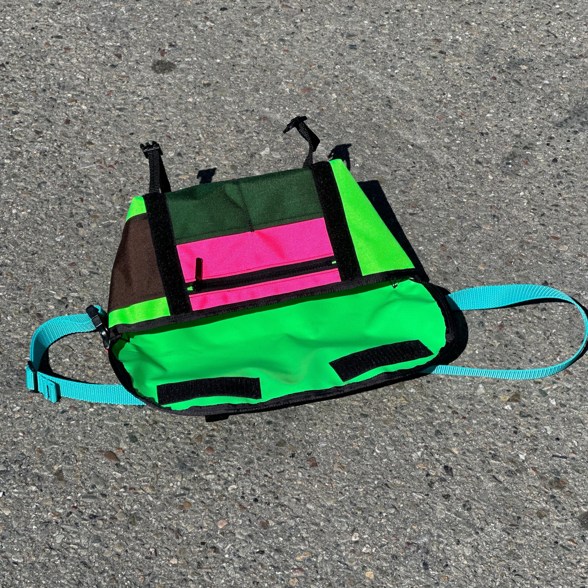hand made in Oakland California. Built tough with cordura fabric outside layer and 18 oz rubberized vinyl inside layer to keep things dry. The minis have a 1” strap, adjust it with buckle slide, don’t your length and rock it. Use it and beat it up!